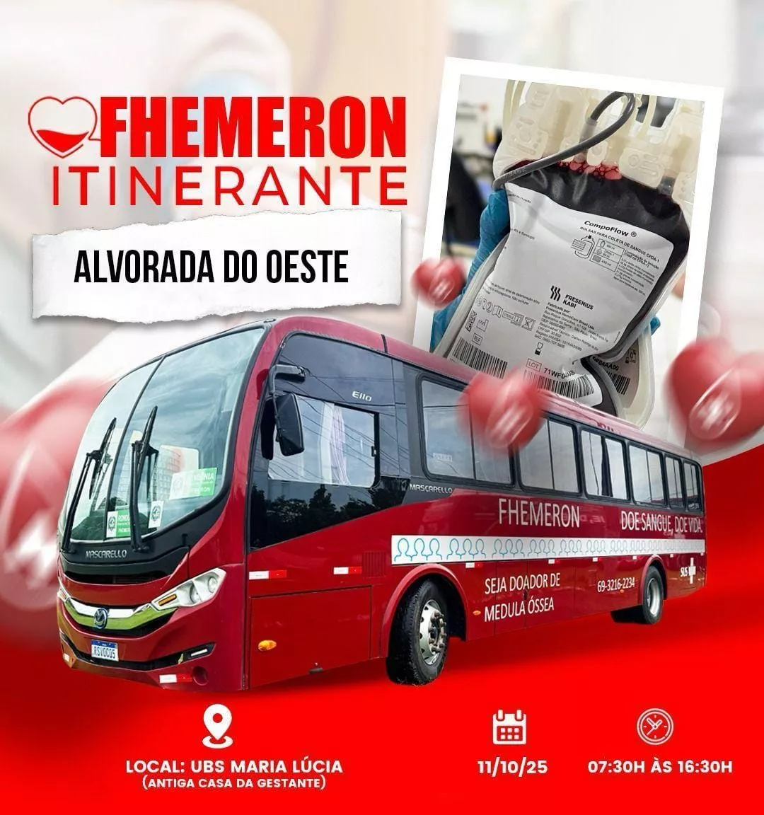 No próximo sábado, dia 11 de outubro de 2025, a FHEMERON itinerante irá realizar uma campanha de doação de sangue na UBS Maria Lúcia (antiga casa da gestante), das 7:30 às 16:30. Toda a sociedade terá a oportunidade de participar desse gesto de amor e solidariedade. Venha você também fazer a sua doação de sangue! O seu gesto de amor pode salvar vidas.