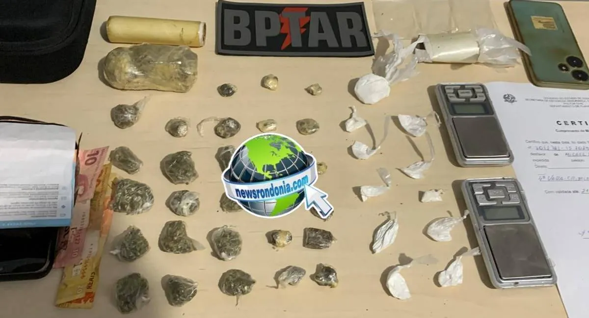 Segundo a PM, os criminosos foram vistos saindo em uma moto Honda Bros de um barraco e foram abordados em seguida. Dentro de uma mochila encontrada no imóvel, os policiais localizaram 38 porções de drogas, entre maconha e cocaína, além de balanças de precisão.