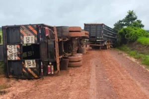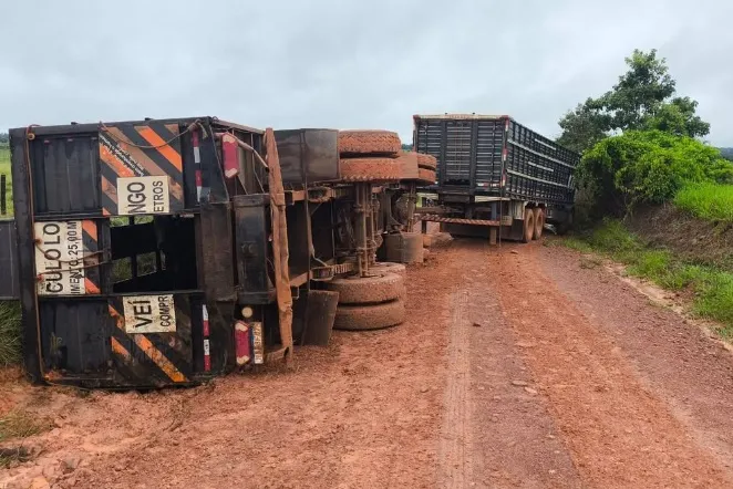 Um caminhão do tipo julieta, carregado de gado, tombou na manhã desta quarta-feira (03) às margens da estrada na Linha 64, próximo à Fazenda Machadão, no município de Alvorada do Oeste (RO).
