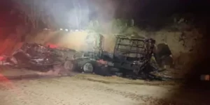 Na noite deste sábado (11), um grave acidente foi registrado na Linha MA-4, a aproximadamente 5 quilômetros da área urbana de Machadinho d’Oeste (RO). Um caminhão tombou e pegou fogo logo em seguida, ficando completamente destruído pelas chamas. O motorista foi salvo por um morador que passava pelo local e agiu rapidamente para evitar uma tragédia.
