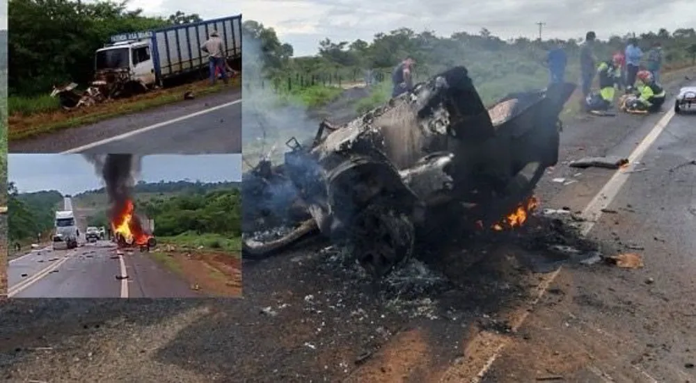 Um grave acidente deixou pelo menos uma pessoa morta na manhã desta terça-feira (9) na BR-364, no trecho que liga Vilhena a Pimenta Bueno, em Rondônia. A colisão envolveu uma carreta, um caminhão boiadeiro e uma camionete Chevrolet S-10, que ficou partida ao meio e pegou fogo logo após o impacto.