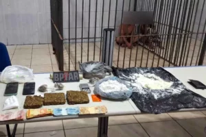 Entre o material apreendido estavam porções de maconha e cocaína. Além dos entorpecentes, a polícia encontrou uma folha de anotações com registro de vendas e uma quantidade de dinheiro em espécie, cuja origem não foi justificada pelo casal.