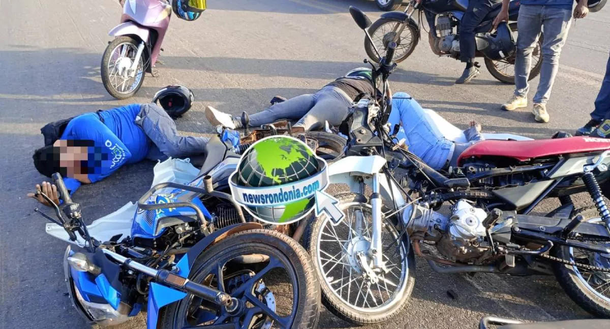 Uma colisão entre duas motos na manhã desta quinta-feira, resultou em três pessoas feridas, uma delas com fratura exposta. O acidente ocorreu no cruzamento da Rua Matrinchã com a Rua da Beira, no bairro Lagoa, zona leste de Porto Velho, Rondônia.