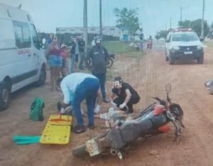 Um acidente envolvendo duas motocicletas foi registrado no início da noite desta sexta-feira (07/11/2025), na Avenida Jorge França Schneider, esquina com a Rua Ipiranga, saída para o setor rural.