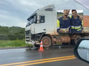 As vítimas foram identificadas como Willian da Silva Pinho, de 27 anos, e Thiago Rodrigues dos Santos, de 31 anos. Os dois seguiam de motocicleta para o trabalho quando foram atingidos por um caminhão no quilômetro 185 da rodovia.