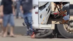 Um acidente registrado na tarde desta quinta-feira (16) por pouco não terminou em tragédia em Alvorada do Oeste. Um jovem, ainda não identificado, viveu momentos de extremo risco após se envolver em uma colisão com uma carreta, nas proximidades de um semáforo na região central da cidade.
