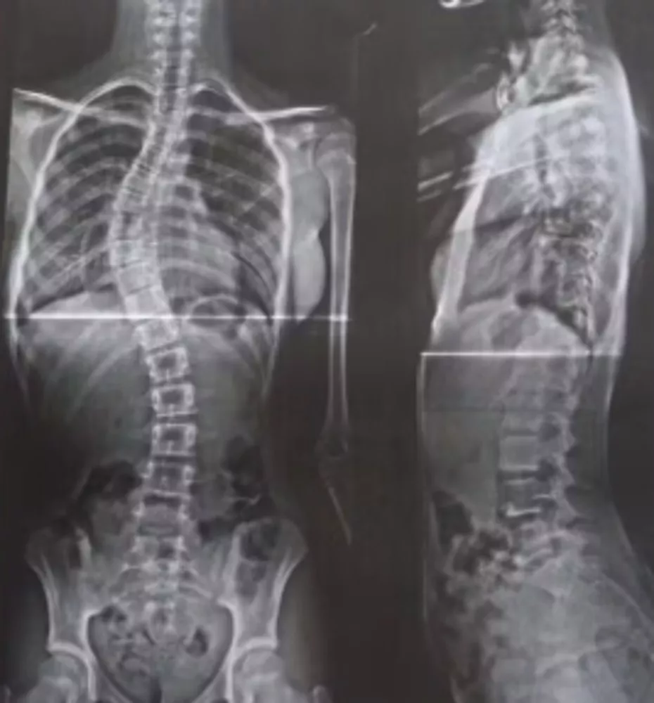 Segundo a mãe, ela já tentou atendimento pelo SUS quatro vezes, mas não encontrou profissionais especializados para o caso. Coluna da menina apresenta uma curva de 52 graus, considerada grave – Foto: Reprodução/acervo pessoal
