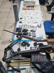 Durante as buscas, os policiais encontraram um total de 192 munições de diversos calibres, incluindo 100 de calibre 9mm, 31 de calibre .38, 32 de calibre .22, 25 de calibre .380, 3 de calibre .45, 2 de calibre .25 e 1 de calibre .36. Também foram apreendidos quatro carregadores de pistola, uma espingarda calibre 36, uma besta (balestra), 71 pedras de crack, 33 porções de maconha, balanças de precisão e comercial, seis rádios comunicadores, três celulares, bicicletas, um maçarico, um motor gerador de energia e R$ 778 em espécie.