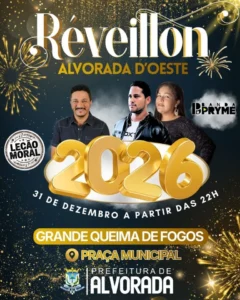A Prefeitura Municipal de Alvorada do Oeste, em Rondônia, prepara uma grande festa de Réveillon para celebrar a chegada de 2026. O evento será realizado na próxima terça-feira, 31 de dezembro de 2025, na Praça Municipal, reunindo moradores e visitantes para uma noite especial de confraternização.