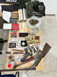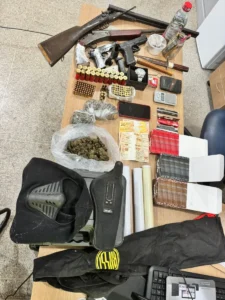 Em um dos imóveis, os policiais apreenderam duas armas de fogo — uma de fabricação artesanal e outra de uso permitido — além de munições de diversos calibres, carregador de pistola e acessórios relacionados ao manuseio de armamento. No local, também foram encontrados simulacro de arma de fogo, balaclava, itens táticos e ferramentas.