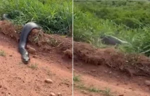 De acordo com relatos, a cobra tentava atravessar a estrada, chamando a atenção de motoristas e pedestres que passavam pelo local. Apesar do susto, o animal acabou retornando para a mata e não representou risco à população.